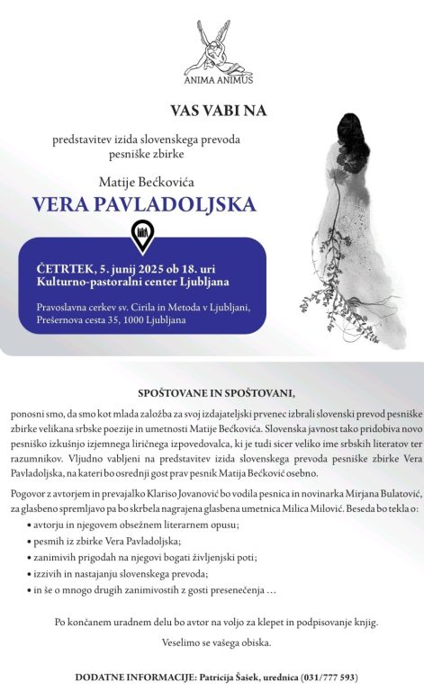 Ove godine imamo izuzetnu čast, da je u Sloveniji čuveni Matija Bećković. U četvrtak 5.6.2025 će se u Parohijskom domu u Ljubljani, održati književno veče, povodom prevoda pesničke zbirke Vera Pavladoljska na slovenački jezik. U petak 6.6. sledi književno veče u Kranju. Detaljan program oba događaja možete pročitati na priloženim plakatima. Manifestaciju organizuje izdavačka kuća Anima Animus.